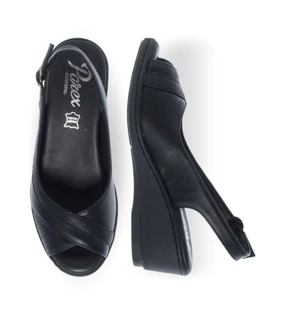 Comfortable peep-toe wedges for women by Parex. Buckle strap fastening at the back. Available in black and beige color. Comfortable leather insole and stable platform sole. Timeless wedges by Parex that every woman should have in her summer collection. Fit ΚΑΝΟΝΙΚΟ Lining Composition SYNTHETIC LEATHER Outer Composition SYNTHETIC LEATHER Bottom Composition LEATHER