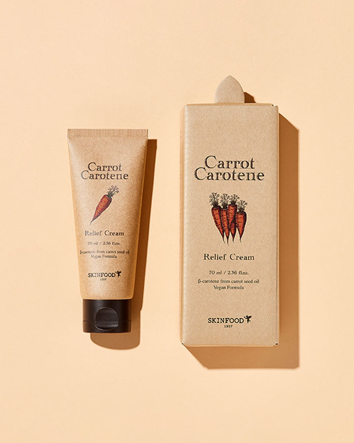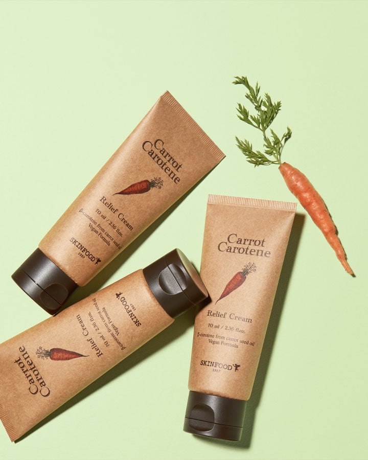 Irritated and sensitive skin? Dry inside by oily outside on the skin? SKINFOOD Carrot Carotene Relief Cream is a holy grail skin relief moisturiser to calm irritated skin from any skin trouble, excessive heat or cold, or any daily stressors. This moisturiser is packed with carrot extract and carrot seed oil, enriched in Beta-Carothene and antioxidants, to relieve and cool down the sensitive skin or the sun over exposed to the sun. Carrot extract is proudly collected by SKINFOOD carrot steaming method to avoid the nutrition loss, greatly improving the water balance of the skin.