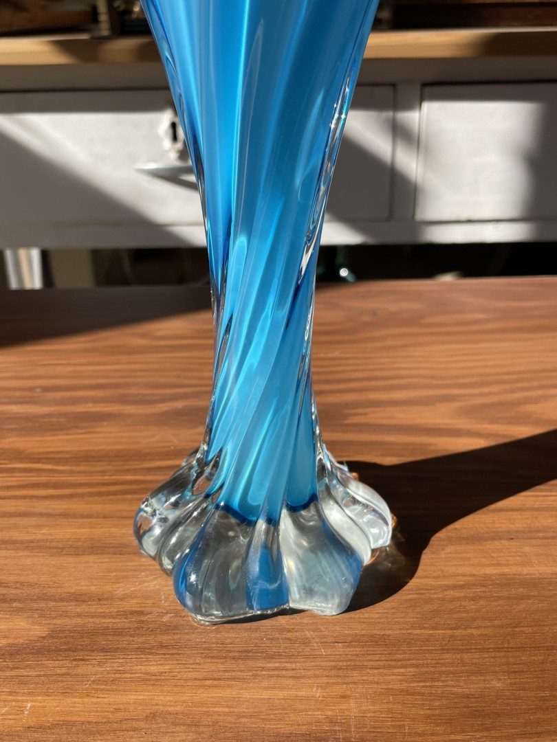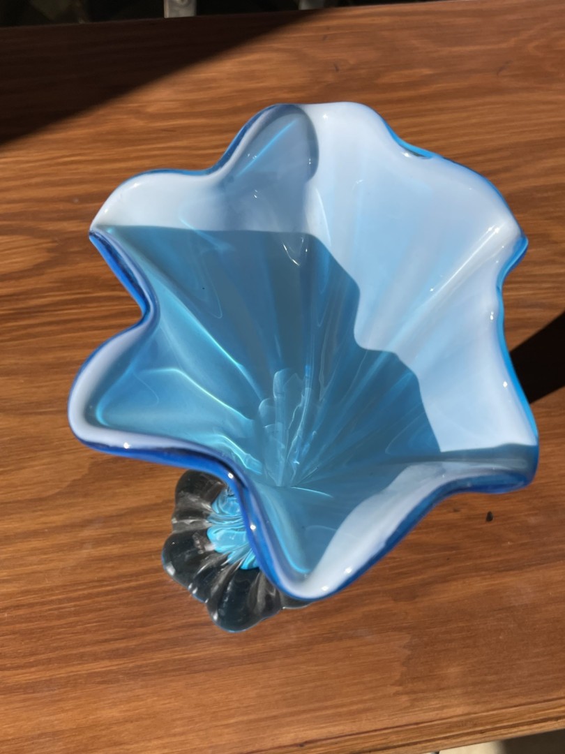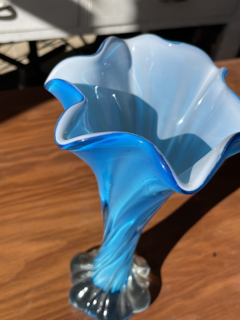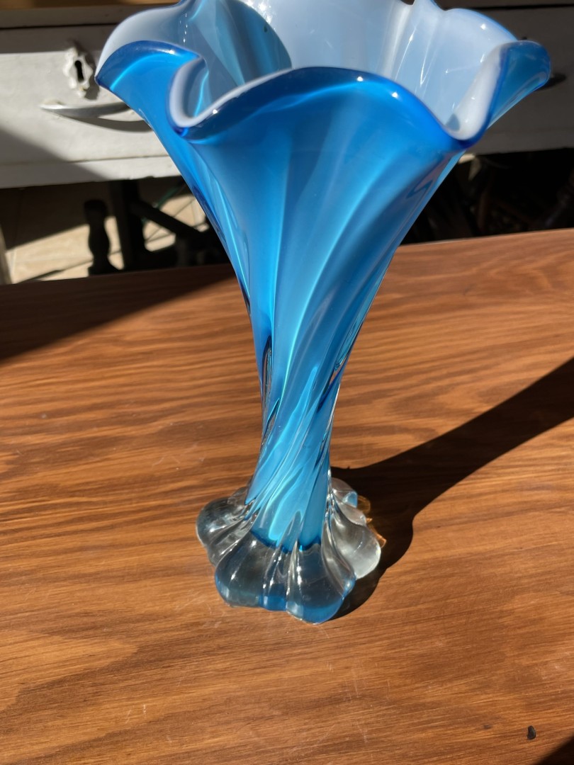 A gorgeous vintage hand-blown glass vase with ruffled edges, swirling blue design, and a clear rippled base. A timeless piece of artistry. \n \nSpecial Aspect: \n \nThe captivating twist of vibrant blue hues paired with the craftsmanship of a hand-blown design makes this vase truly one-of-a-kind. This stunning vintage hand-blown glass vase features a mesmerizing swirl of ocean-blue hues that transitions seamlessly into a clear, rippled base. With its ruffled flared top and elegant twisted form, this piece is a true testament to the artistry of mid-century glassmakers. Perfect as a standalone statement piece or to showcase fresh blooms, this vase adds a touch of timeless sophistication to any interior decor. \n \nEstimated Era: Mid-20th century, circa 1960s-1970s. \n \nStorytelling: \n \nImagine this vase catching the morning sunlight on your windowsill, its vibrant blue hues reflecting the serene waves of the sea. Each curve and ripple tells the story of a craftsman’s dedication, transforming molten glass into a piece that bridges artistry and functionality. Let it bring the same tranquility and beauty into your home.