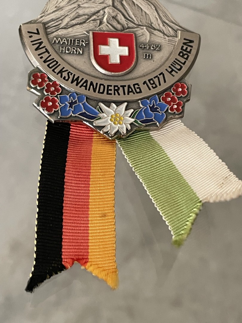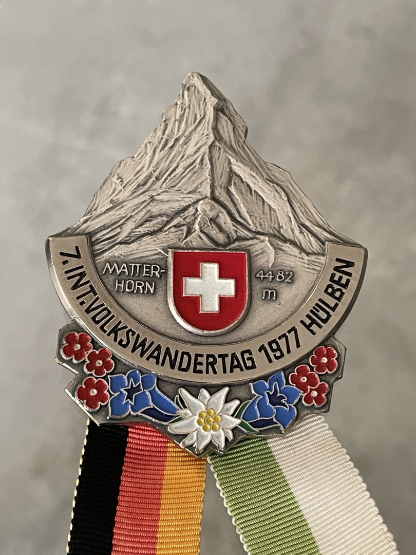 Bring a piece of the Swiss Alps into your collection! This Matterhorn medal represents more than an event; it embodies the majesty of the mountains, the thrill of hiking, and the enduring charm of Swiss traditions. Perfect for enthusiasts of alpine culture and history, this medal serves as a proud reminder of the strength, beauty, and adventure that only the Alps can offer. Display it and let it inspire your next journey into nature! \n \nSpecial Aspect: \n \nExquisite Matterhorn design with Edelweiss and alpine flowers, encapsulating Swiss heritage and mountain spirit. This 1977 Volkswandertag medal from Hülben celebrates the grandeur of the Matterhorn, Switzerland’s most famous peak standing at 4,482 meters. The beautifully crafted medal features a detailed relief of the Matterhorn with the Swiss flag and alpine flowers like Edelweiss, capturing the essence of Swiss mountain heritage. Adorned with vibrant ribbons in black, red, yellow, and green, it’s a testament to the unity of nature and adventure, perfect for collectors who cherish the spirit of the Alps and hiking culture. \n \nStorytelling: \n \nFeel the spirit of adventure and Swiss pride with this remarkable piece. Imagine the sense of accomplishment and unity shared among hikers as they trekked through breathtaking landscapes during the 1977 Volkswandertag. Owning this medal brings you closer to that experience, allowing you to connect with nature, tradition, and the legacy of alpine exploration. It’s not just a collectible; it’s a tribute to all who love the mountains and the thrill of the journey.
