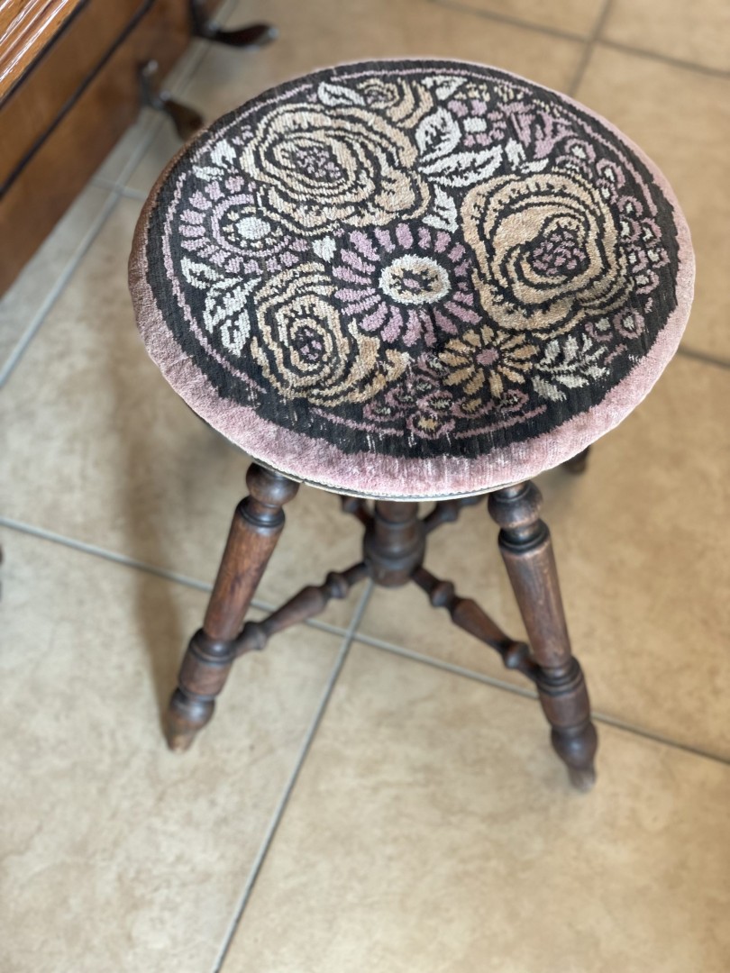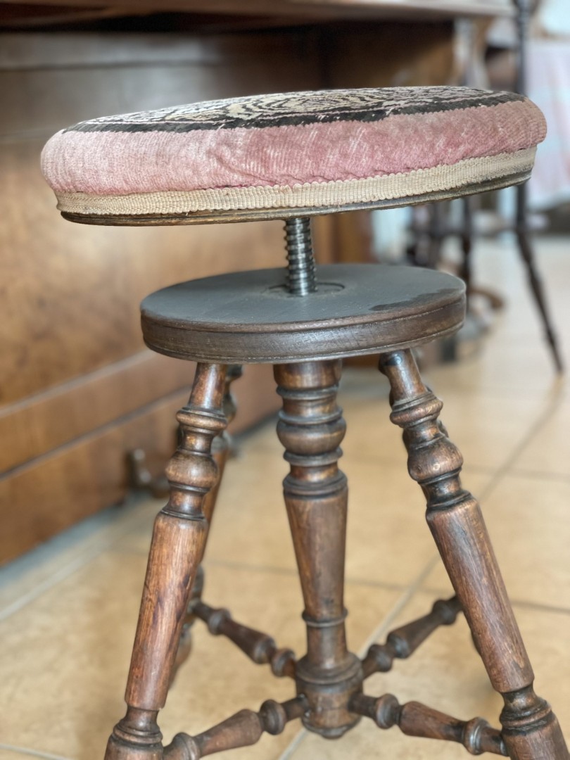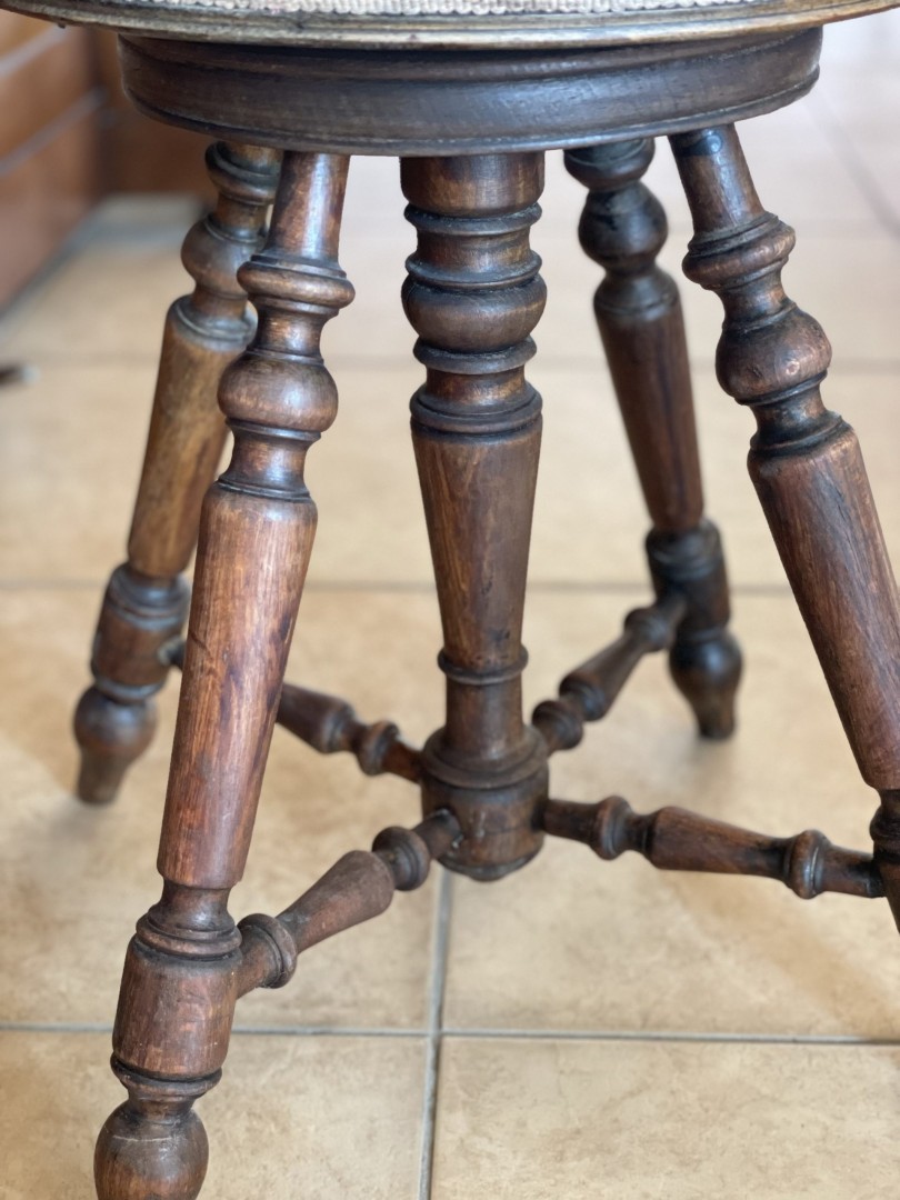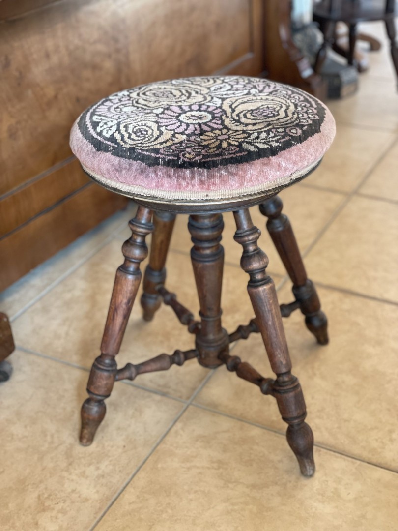 Late 19th-century antique adjustable Victorian piano stool with floral embroidered upholstery and turned wooden legs. Perfect for collectors or as a unique decor piece. This elegant antique adjustable piano stool, dating back to the late 19th century (circa 1880s), features a beautifully embroidered floral upholstery and a sturdy wooden frame with turned legs, crafted in the classic Victorian style. The adjustable height function adds both practicality and charm, making it suitable for musicians or as a unique accent piece. The intricate craftsmanship and design reflect its vintage appeal, while the original upholstery shows gentle wear, further enhancing its authenticity. Perfect for antique collectors or those seeking a timeless decor piece for a music room or living space, this stool is a wonderful representation of Victorian-era furniture.