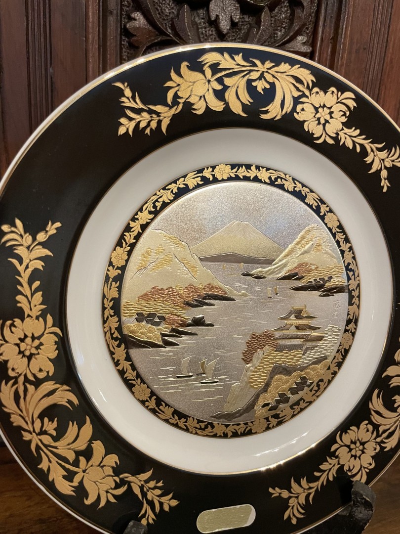\nThis plate features a finely detailed design that likely depicts scenes from nature or Japanese folklore. Rich gold and silver tones stand out beautifully against a dark background. You can easily notice the craftsmanship in the precise etchings. Moreover, the gilding reflects light beautifully, adding remarkable depth , texture to the artwork, making it eye-catching.