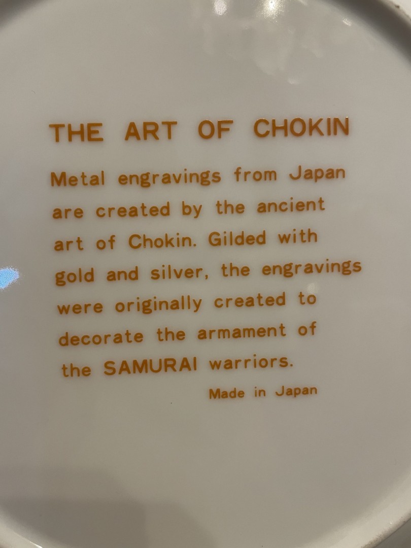 Metal engravings from Japan are created by the ancient art of Chokin. Gilded with gold and silver, the engravings were originally created to decorate the armament of the SAMURAI warriors. \nMade in Japan.