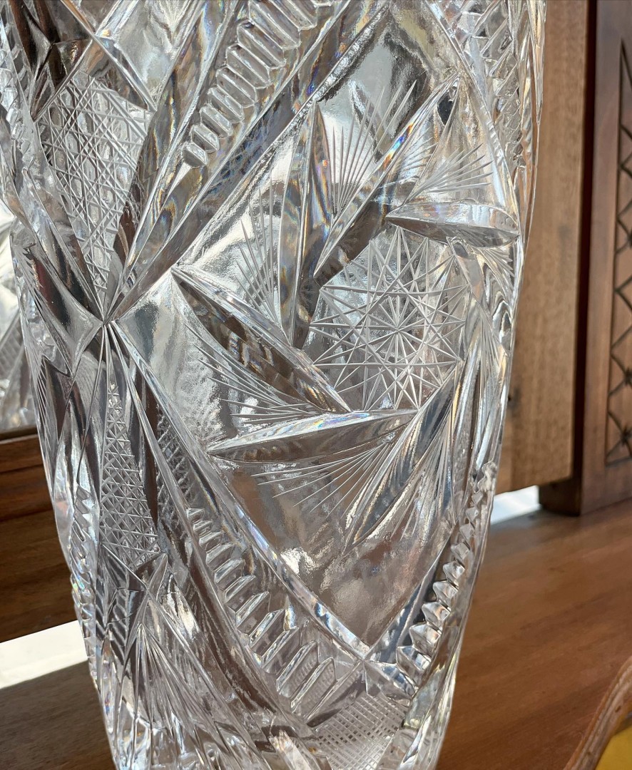 \nAt first glance, the vase reveals a brilliant clarity and crystal-cut pattern that beautifully reflects light. Moreover, its shape—tapered at the base and gently flaring at the rim—creates graceful balance. The pattern includes intricate starburst details and faceted cuts, which offer both visual interest and reflective sparkle.