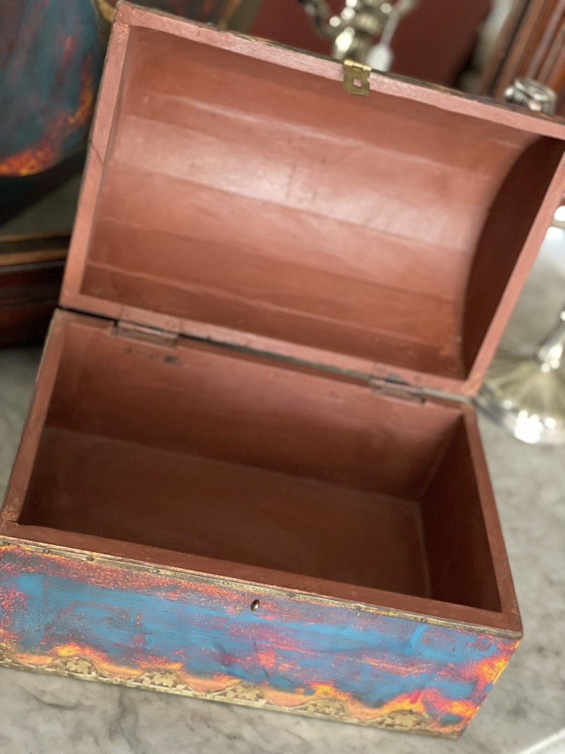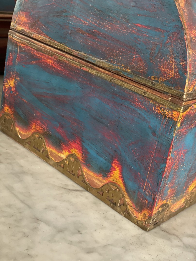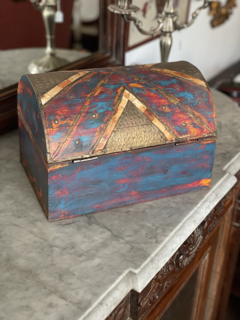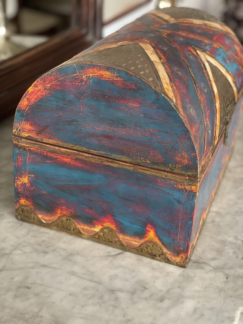 Bring a vibrant touch to your decor with this colorful wooden half-round treasure chest, embellished with exquisite bronze details. Bring a vibrant touch to your decor with this colorful wooden half-round treasure chest, embellished with exquisite bronze details. Perfect for storing cherished keepsakes or as a charming accent piece, this treasure chest combines functionality with a striking design, making it a delightful addition to any room.