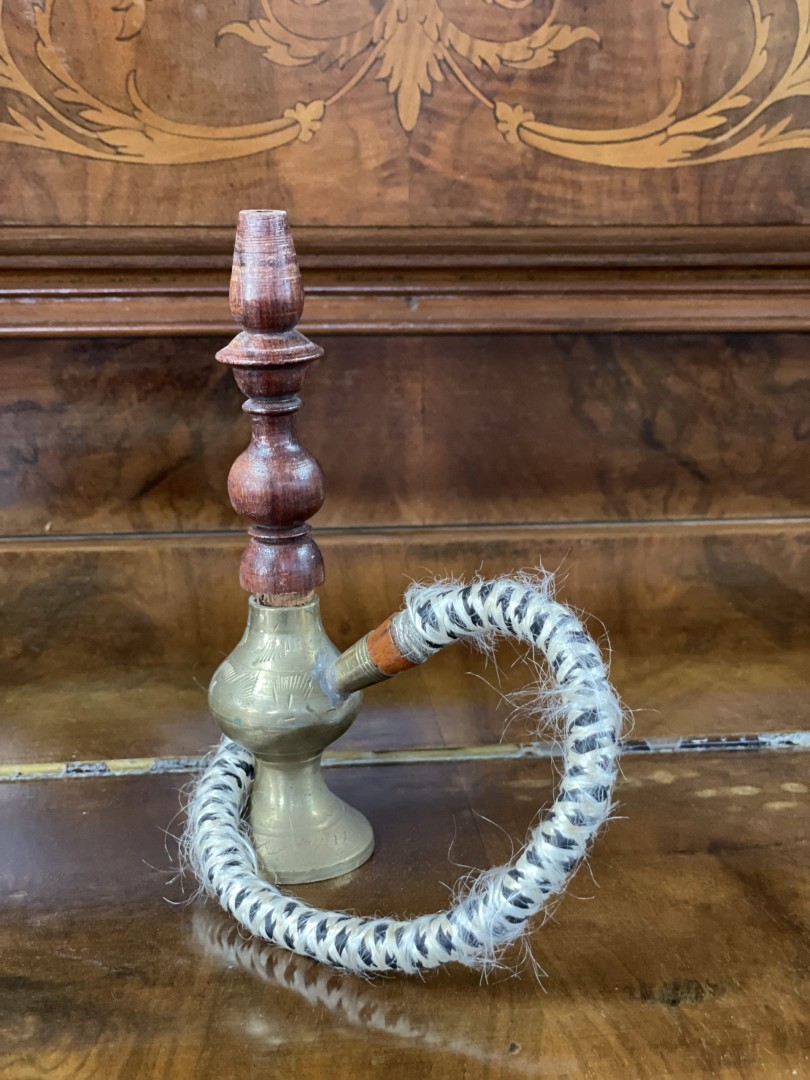 Small vintage brass and wood hookah with a hand-engraved base and woven hose. A charming and compact decorative piece with cultural significance. \n \nSpecial Aspect: \n \nIts compact size, paired with detailed brass engraving and a woven hose, makes it a perfect blend of artistry and charm. \n \n This small vintage hookah, crafted from brass and wood, is a charming representation of Middle Eastern artistry. Despite its compact size, it boasts an elegant brass base with delicate hand-engraved patterns, complemented by warm wooden components. The intricately woven hose adds a traditional touch, showcasing exceptional craftsmanship. Its petite design makes it perfect for display on a shelf, desk, or coffee table, adding a unique cultural flair to any space. \n \nStorytelling: \n \nPicture this petite hookah gracing the corner of a study or mantel, a piece of art that whispers stories of tradition and gatherings long ago. Its small size only adds to its charm, making it a delightful treasure that brings history and craftsmanship into your home.