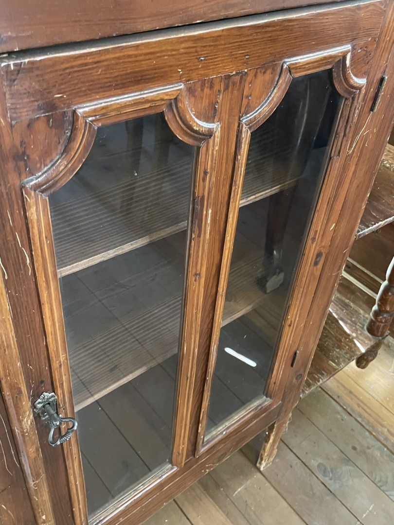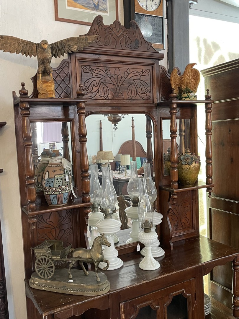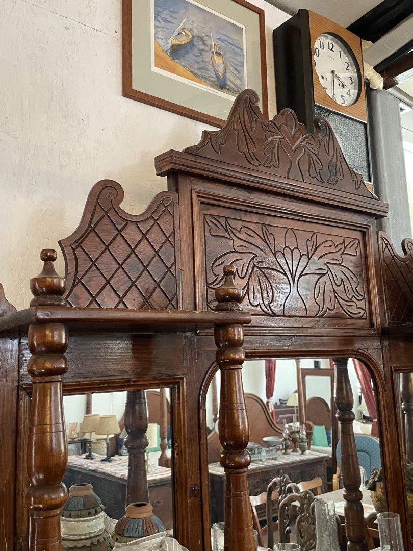 Vintage console from Cyprus circa 1950 with mirror, hand-carved floral motifs, glass-door cabinet, and classic turned-wood details. A timeless piece with heart and heritage. \n \nSpecial Aspect: \n \nIts mirror-backed design with carved open shelves blends display and function—making it both a decorative statement and a practical storage piece. This authentic vintage Cypriot console from circa 1950 captures the charm and craftsmanship of mid-20th century traditional furniture. Handcrafted from solid wood, it features ornate hand-carved floral designs, a tall back with an integrated mirror, elegant turned columns, and spacious side shelves. The lower section offers a beautiful glass-front cabinet, perfect for displaying heirlooms, books, or ceramics. \n \nIts timeless design makes it ideal for use in entryways, dining rooms, or any space needing a touch of Mediterranean warmth and character. Each detail reflects the pride and patience of old Cypriot craftsmanship, making it not just a furniture piece, but a story in wood. \n \nStorytelling: \n \nThis console once stood in a proud Cypriot home, polished for holidays and filled with memories. Imagine it now in your space—bringing that same sense of tradition, elegance, and soulful charm into a modern life full of new stories.