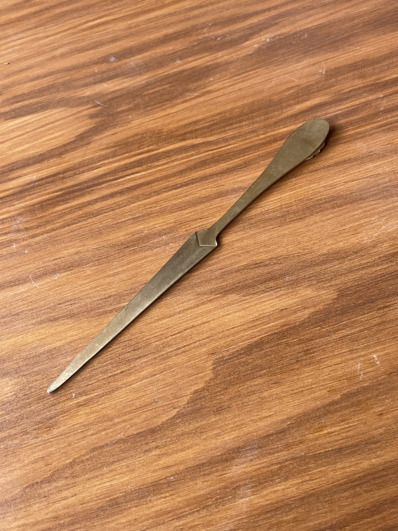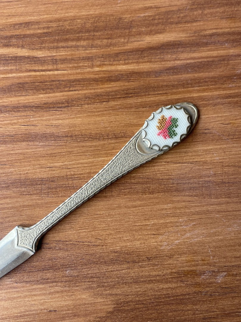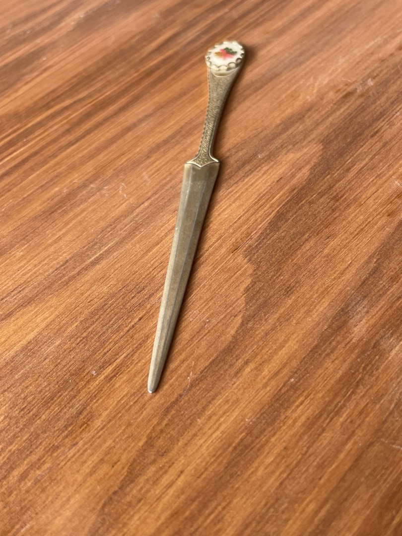 Mid-20th-century gilded brass letter opener with hand-painted floral detail, a charming blend of functionality and artistry. \n \nSpecial Aspect: \n \nThe hand-painted floral detail, reminiscent of traditional embroidery, adds a touch of unique craftsmanship to this practical piece. This exquisite vintage letter opener, crafted from gilded brass, features a stunning hand-painted floral detail embedded in a delicate porcelain-style medallion at its handle. The fine craftsmanship and intricate cross-stitch-style design evoke the charm of mid-20th-century European artistry, making it not only a functional accessory but a timeless decorative piece. Its textured grip and elegant blade reflect the era’s attention to detail, combining utility with sophistication. A perfect gift for lovers of antique stationery or a distinctive addition to any vintage collection. \n \nEstimated Era: 1950s \n \nStorytelling: \n \nImagine a time when handwritten letters carried heartfelt messages across great distances. This gilded letter opener might have graced the desk of someone awaiting such correspondence, its blade carefully slicing open envelopes filled with love or important news. Let it remind you of the timeless joy of tangible connections in our digital world.