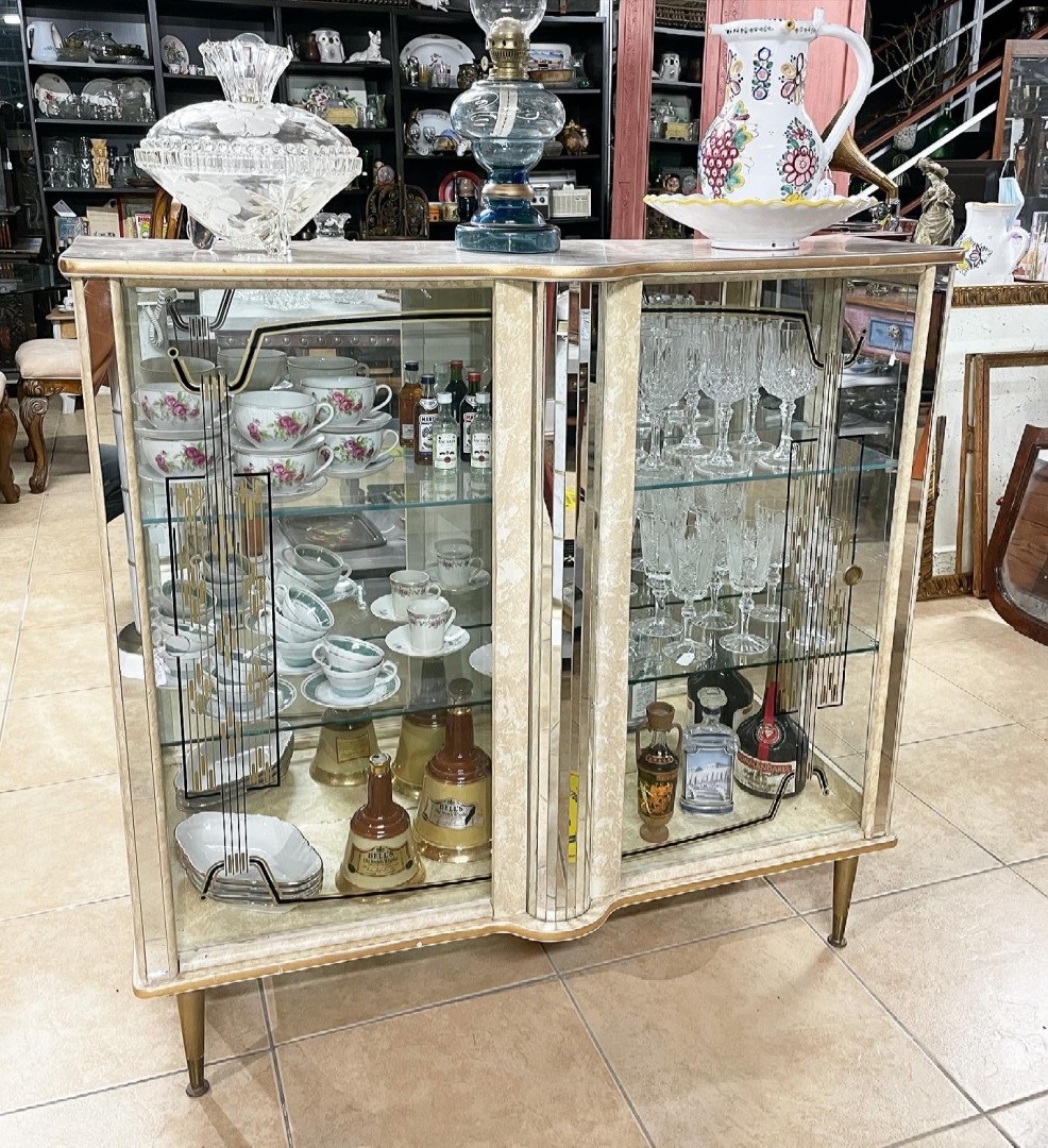 Vintage display cabinet from around 1960, featuring intricate golden paint details and mirrored accents. Vintage display cabinet from around 1960, featuring intricate golden paint details and mirrored accents, designed to elegantly highlight showcased items. A truly exceptional piece that exudes charm and character.