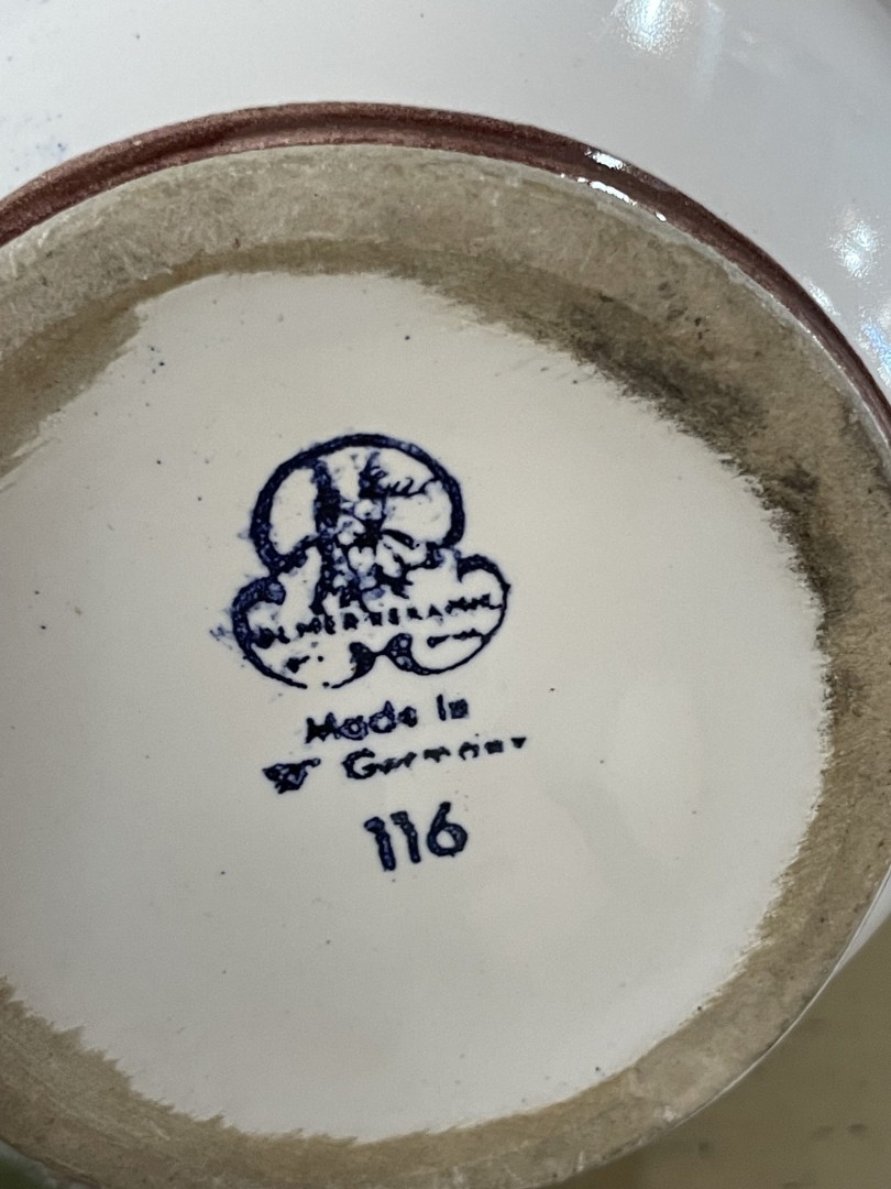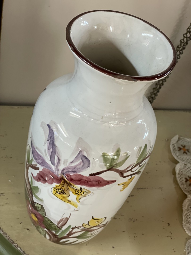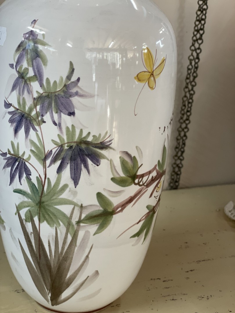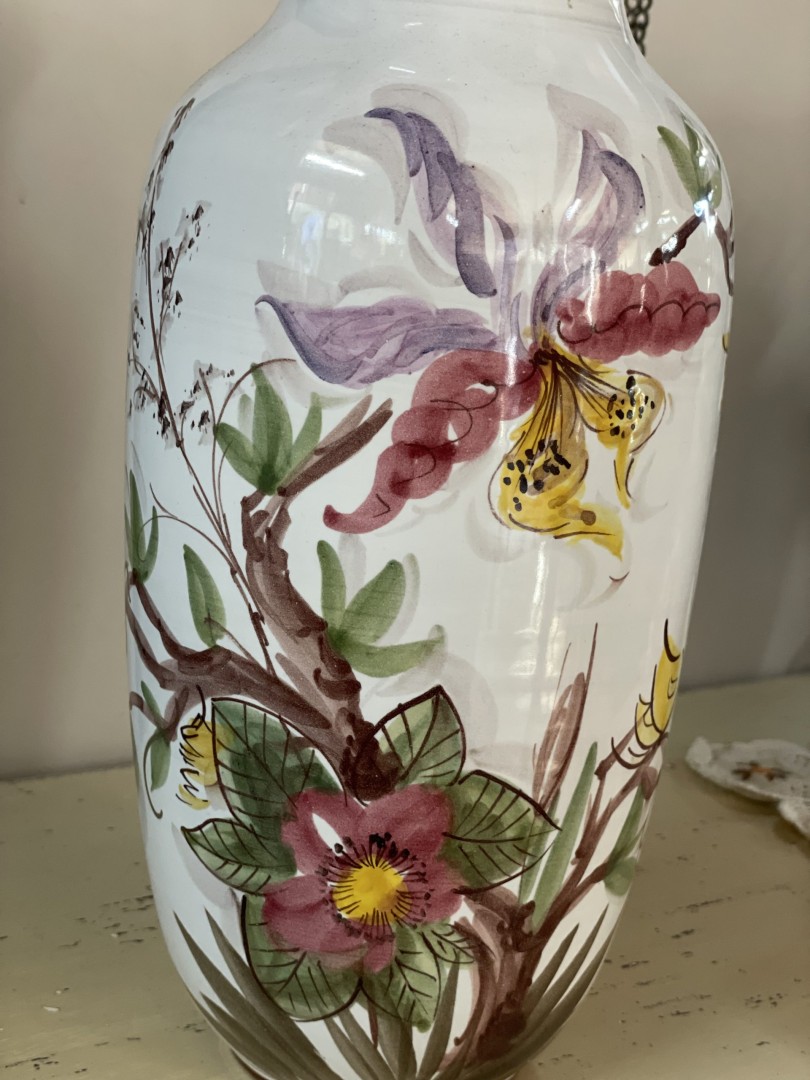 Vintage floral ceramic vase from West Germany, model 116. Mid-century piece with vibrant flower and butterfly design. Elegant and nostalgic. \n \nSpecial Aspect: \n \nThe soft butterfly detail on the reverse side gives it an enchanting surprise when turned — perfect for 360° display. This elegant vintage floral ceramic vase, made in West Germany, is a striking example of mid-century European craftsmanship. Featuring detailed botanical motifs of orchids, blossoms, and a soft yellow butterfly, this vase captures the beauty of nature in a timeless design. Its graceful silhouette and glossy finish make it perfect for adding a refined touch to any space — from a romantic shelf arrangement to a modern vintage-inspired centerpiece. \n \nStamped on the base with “Made in West Germany” and model number 116, this vase likely dates to the 1950s–1960s, a charming era of bold floral motifs and sophisticated form. \n \nEstimated Era: \n \n1950s–1960s \n \nStorytelling: \n \nThis vase feels like a memory — a piece that once stood on a grandmother’s table, holding fresh blooms and gentle morning light. It’s more than just decoration; it’s a whisper of the past, a quiet moment frozen in ceramic. Now, it waits to bring a new story into your home.