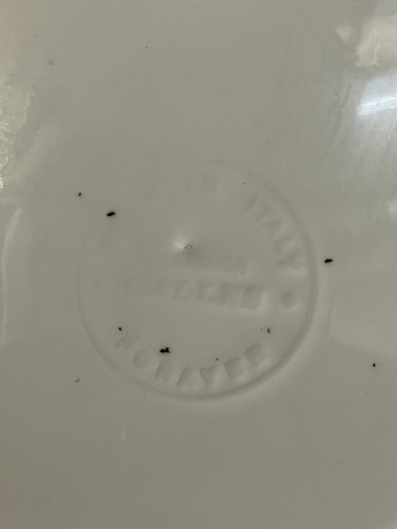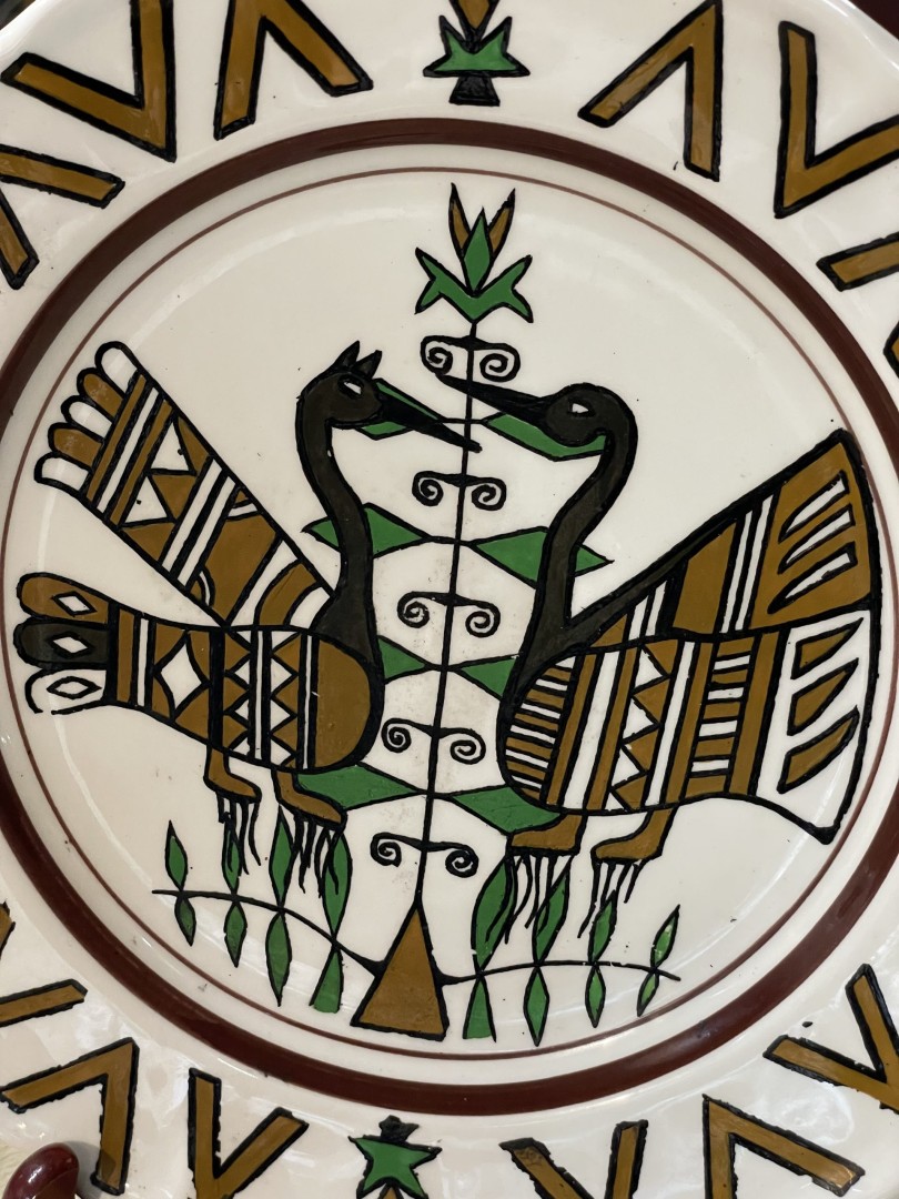 A vintage Italian ceramic plate by Galletti, featuring hand-painted peacocks and traditional folk art patterns. A perfect piece for collectors or rustic decor enthusiasts. \n \nSpecial Aspect: \n \nThe intricate peacock design, with its bold and earthy color palette, reflects the rich tradition of Italian folk art pottery. \n \nEstimated Era: \n \nMid-20th Century (1950s-1970s) This beautifully hand-painted vintage ceramic plate from Italy features a striking folk art design of two elegant peacocks facing each other, surrounded by traditional geometric and botanical patterns. Marked with “Galletti Forli Italy” on the back, this plate showcases mid-20th-century craftsmanship and cultural heritage. The earthy tones of brown, green, and mustard yellow give it a warm and rustic charm, perfect for collectors or as an artistic wall display. \n \nStorytelling: \n \nImagine adding this charming Italian plate to your collection, a piece that speaks of timeless elegance and the beauty of folk art. Its vibrant yet earthy colors bring life and culture to any space, evoking the spirit of Italian tradition and artistry.