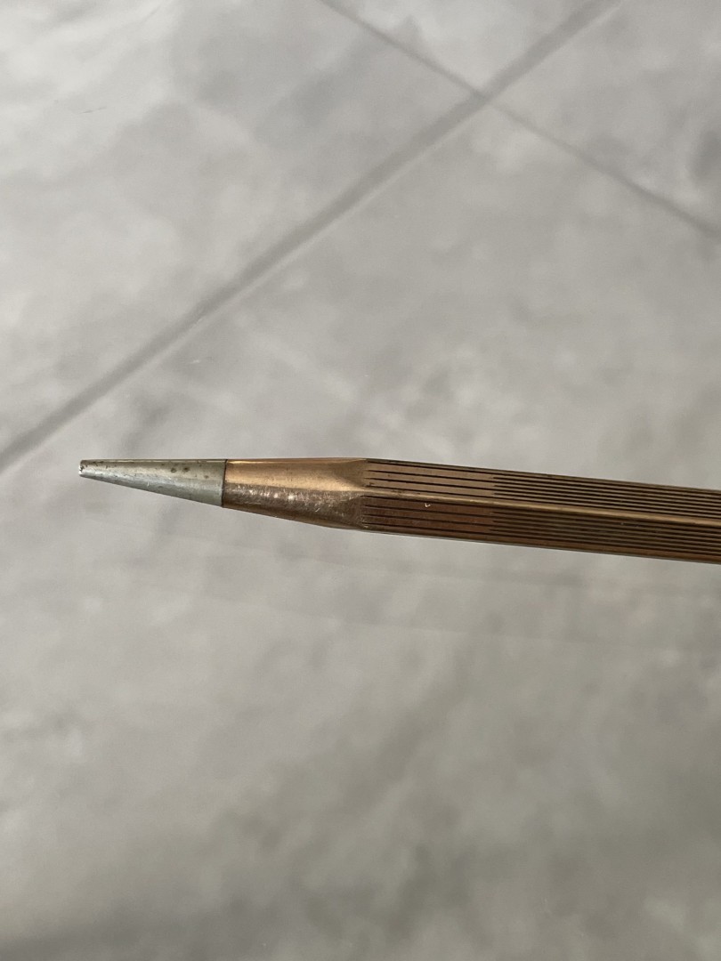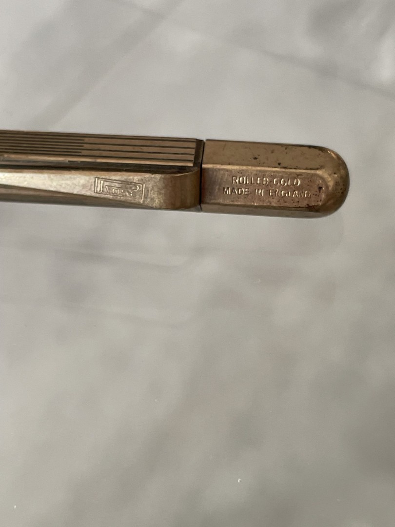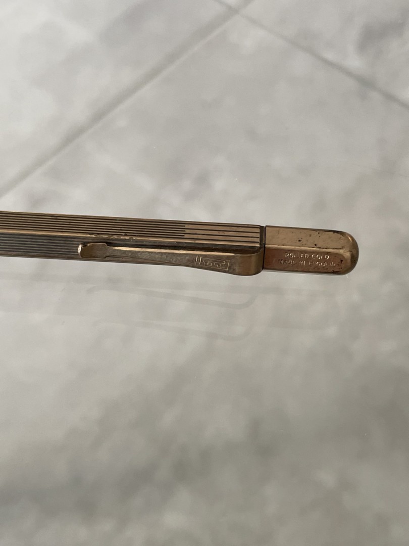 A vintage rolled gold mechanical pencil by Rose, crafted in England with elegant ribbed detailing. A sophisticated choice for collectors and those who appreciate classic writing instruments. \n \nSpecial Aspect: \n \nThe Rose brand’s commitment to quality shines in the rolled gold finish, making this mechanical pencil not only a functional tool but also a luxurious collectible. Its meticulous ribbed detailing and enduring quality reflect a level of craftsmanship rarely seen today. Ideal for anyone who values both aesthetics and history in their stationery, this pencil transforms simple writing into a refined experience. This exquisite vintage mechanical pencil from Rose, crafted in England, features a rolled gold finish that radiates timeless sophistication. The finely ribbed body and streamlined design reflect the brand’s dedication to quality and elegance. Known for creating luxurious writing instruments, Rose has imbued this pencil with both beauty and practicality, making it a perfect piece for collectors or those with a refined taste in stationery. Its comfortable weight and smooth finish make it ideal for daily use, adding a touch of vintage charm to every word written. \n \nEra: Likely mid-20th century, England \n \nStorytelling: \n \nImagine holding this Rose mechanical pencil, a piece that has likely graced the hands of many over the years, each line and note adding to its story. This is more than a pencil; it’s a reminder of the elegance and attention to detail of a bygone era. For those who cherish vintage elegance and craftsmanship, this pencil offers a unique connection to history with every use.