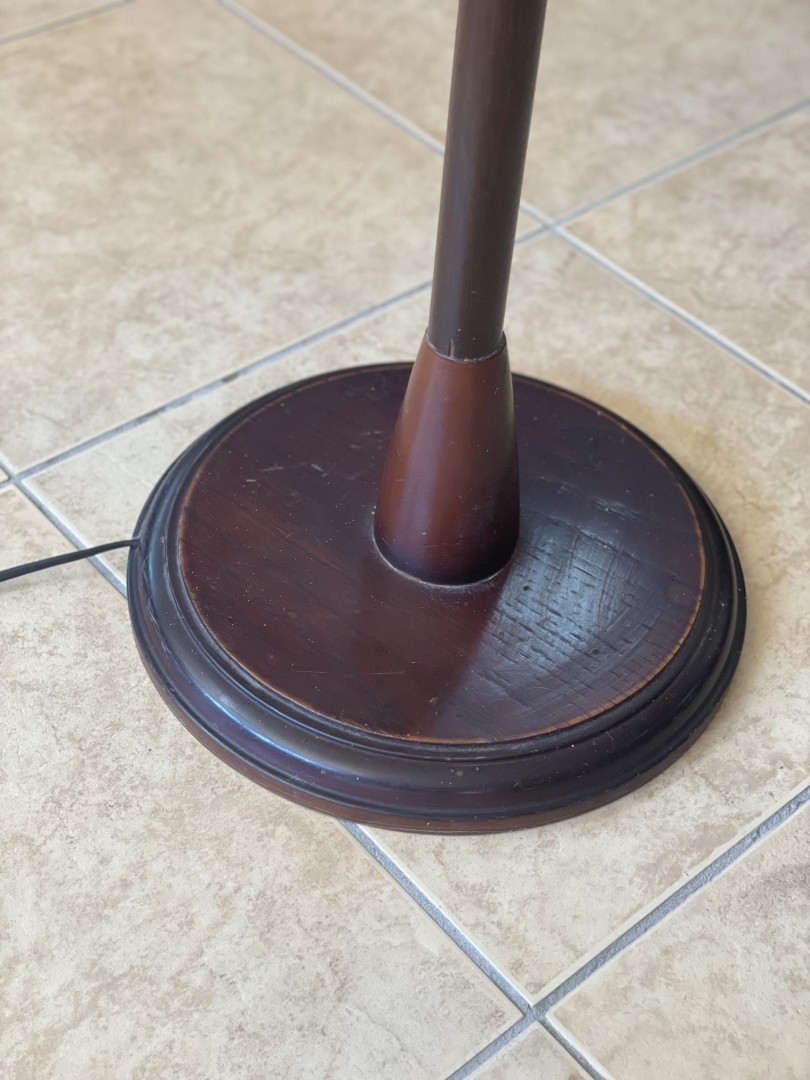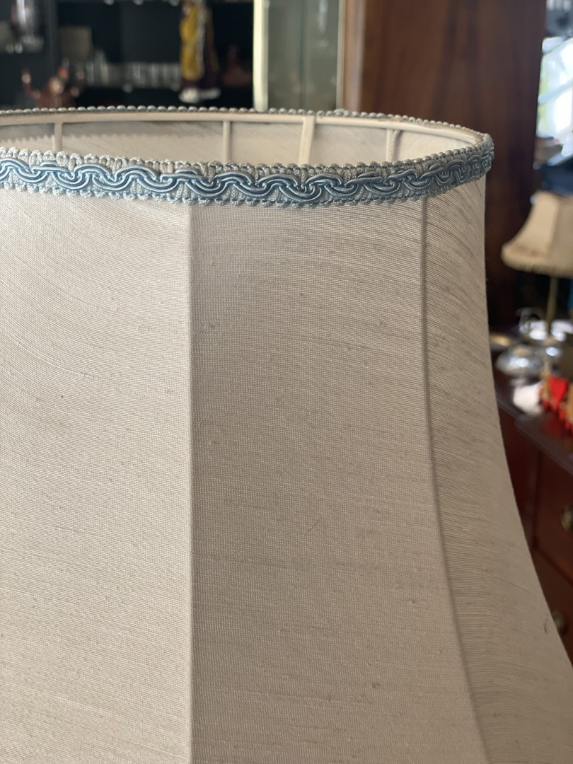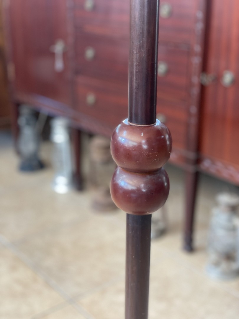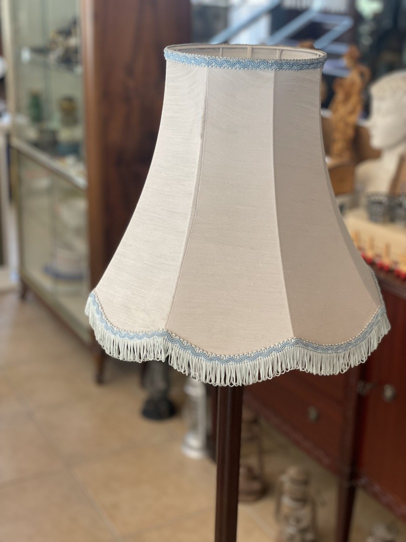 This elegant vintage wooden floor lamp features a beautifully crafted wooden base with intricate details, exuding a timeless appeal. The lamp is adorned with a soft, fabric lampshade that adds a touch of sophistication to any room. The lampshade is embellished with delicate trim, enhancing its classic design. This elegant vintage wooden floor lamp features a beautifully crafted wooden base with intricate details, exuding a timeless appeal. The lamp is adorned with a soft, fabric lampshade that adds a touch of sophistication to any room. The lampshade is embellished with delicate trim, enhancing its classic design. Perfect for living rooms, bedrooms, or study areas, this floor lamp not only provides warm, ambient lighting but also serves as a stylish decorative piece. Ideal for those who appreciate antique furniture and vintage décor.