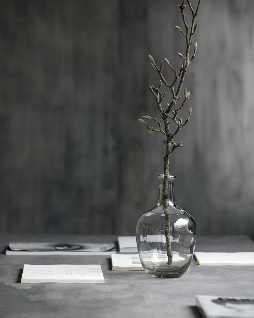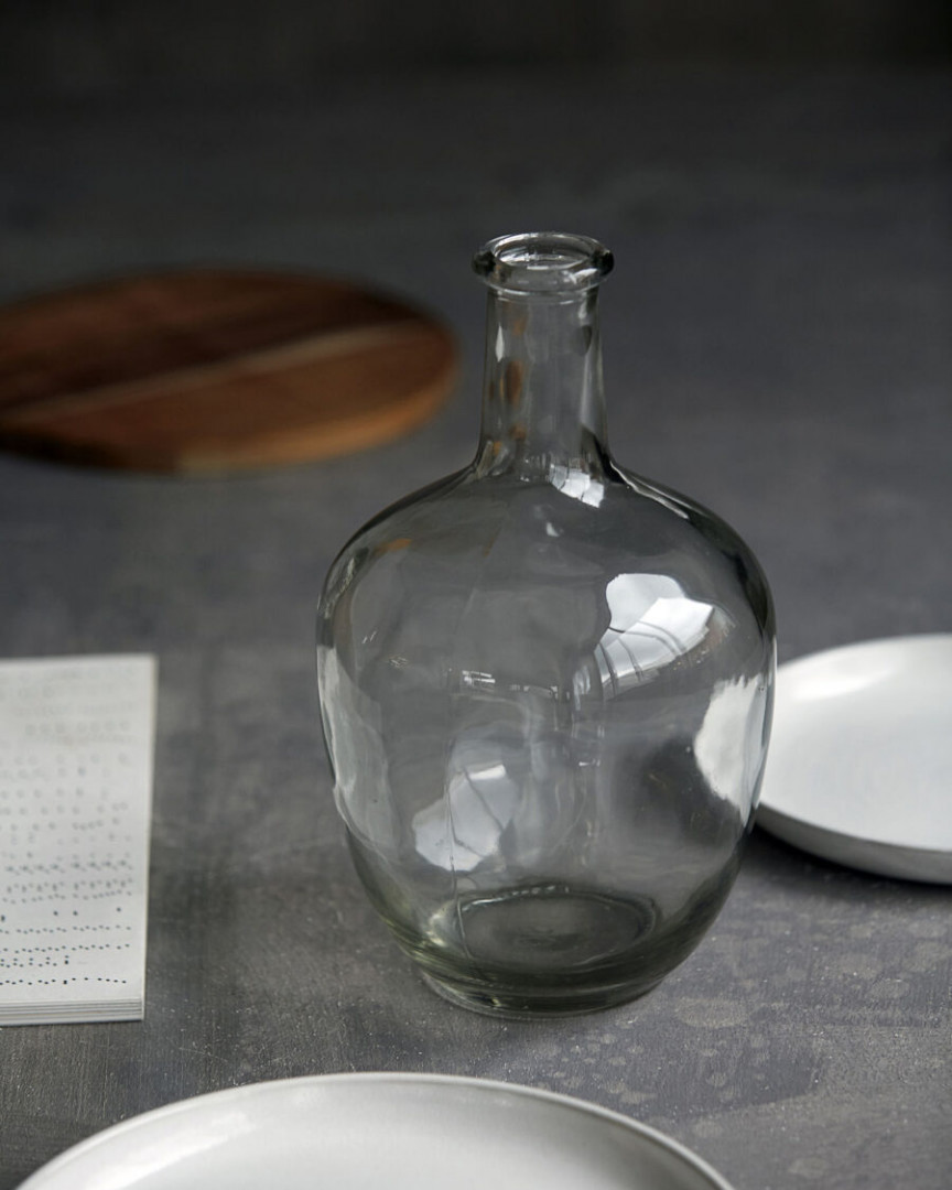 VASE/BOTTLE, GLASS, CLEAR h: 29 cm, dia: 18 cm Glass is an elegant vase with a nice, organic shape. The vase has a narrow neck and a round bottom. It is therefore extremely suitable for a twig from your garden. Use the vase to create a calm, natural environment in your home. Pour some water into the bottom of the vase and decorate it with a single twig. The combination of simple materials will create a wonderful look with some spring notes.