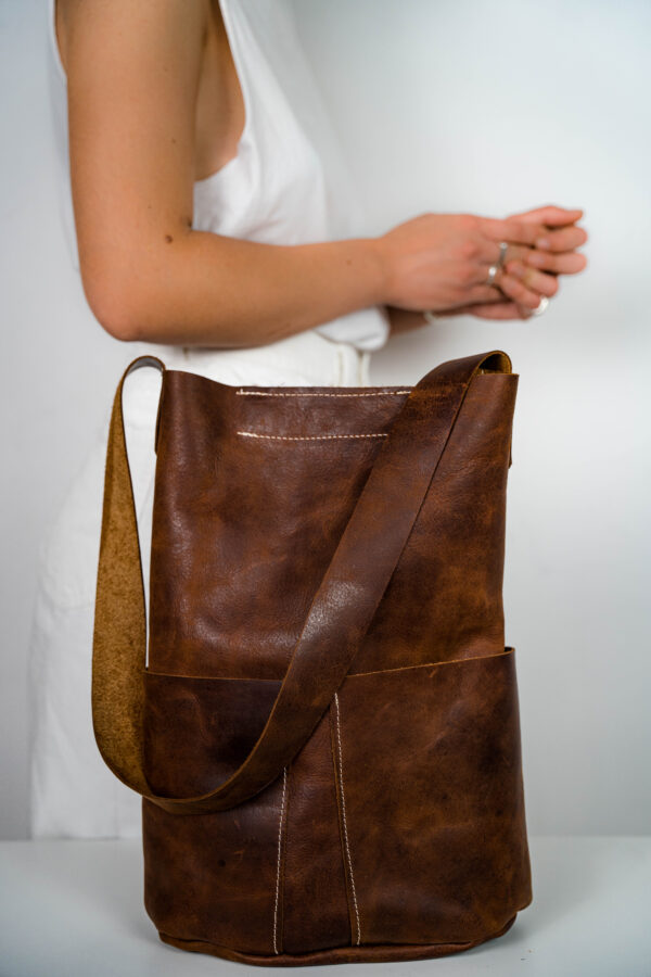 H 39cm x W 34cm Brown color Handmade authentic leather bags. Made by MA FIL brand. Designed and produced in Greece.