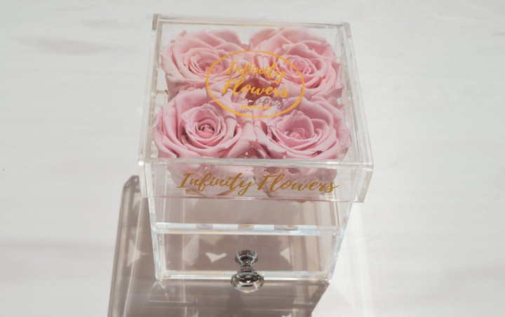 El Ideal features 4 stunning infinity roses in a transparent plexi glass box with drawer that protects the roses while enhancing its beauty.