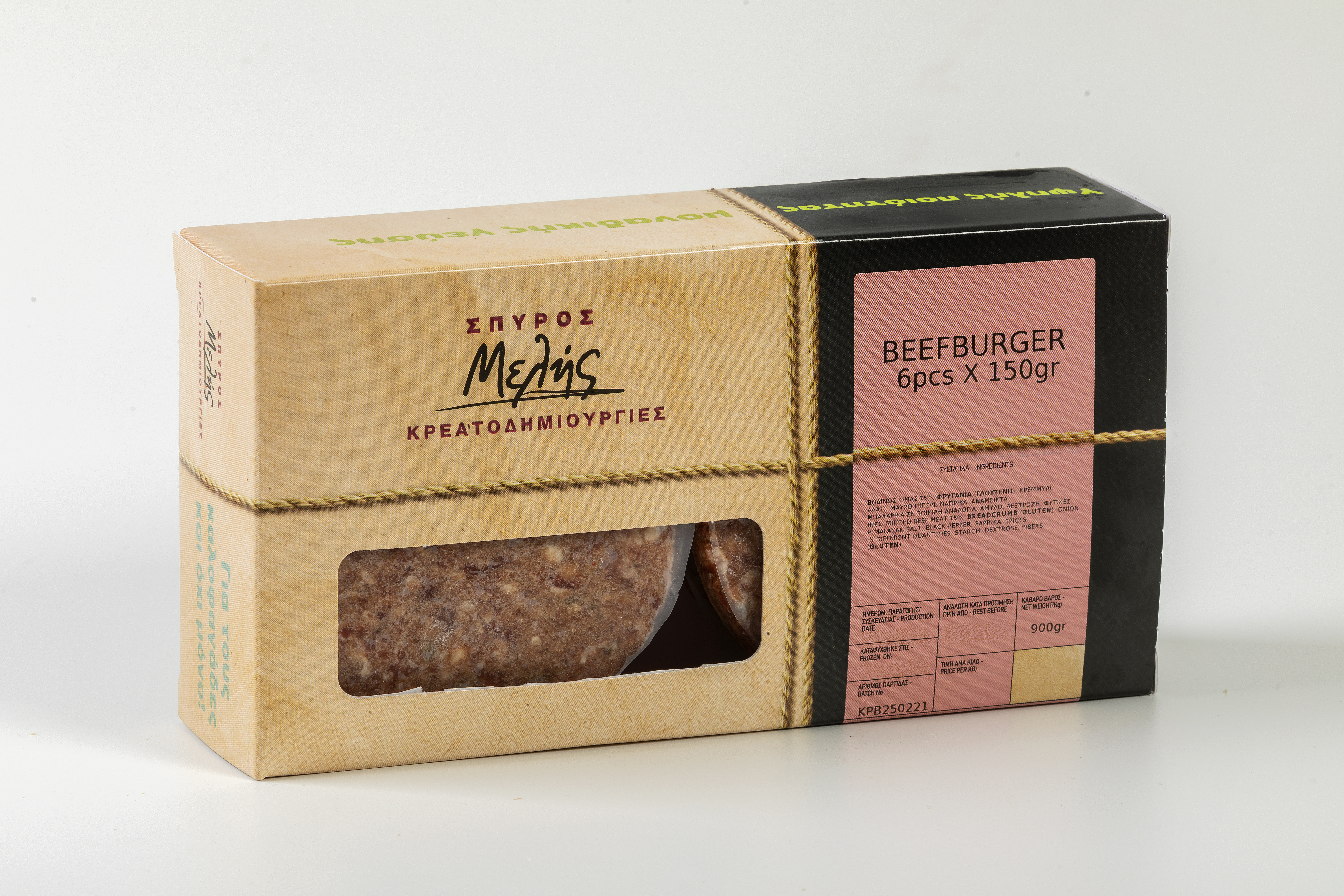 Συστατικά: Βοδινός κιμάς 75%, φρυγανιά (γλουτένη), κρεμμύδι, μαϊντανός, αλάτι, μαύρο πιπέρι, πάπρικα, ανάμεικτα μπαχαρικά σε ποικίλη αναλογία, άμυλο, δεξτρόζη, φυτικές ίνες.